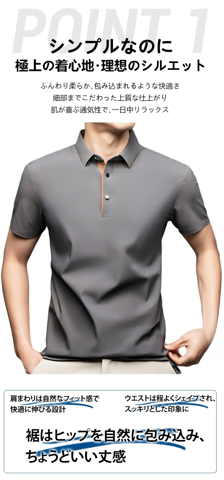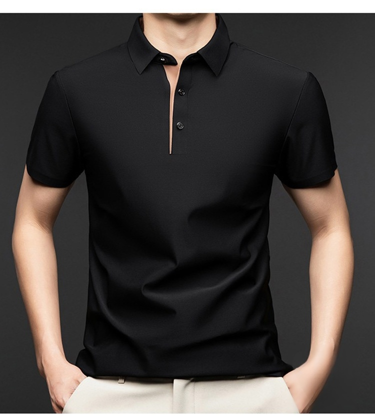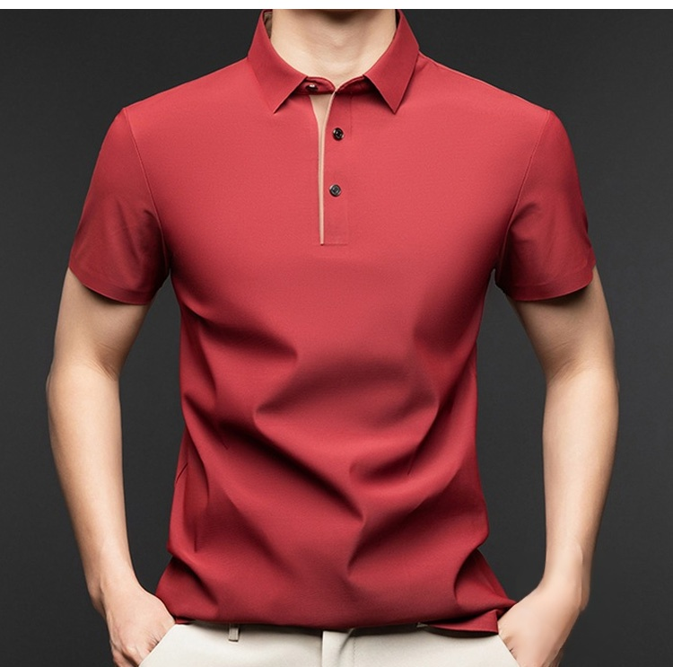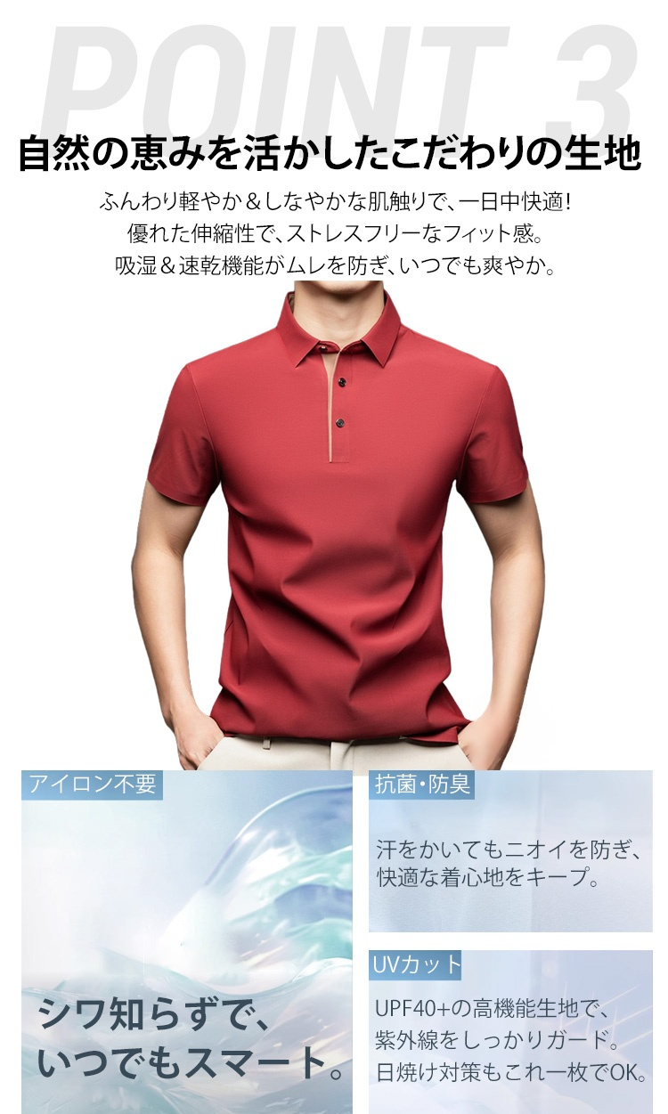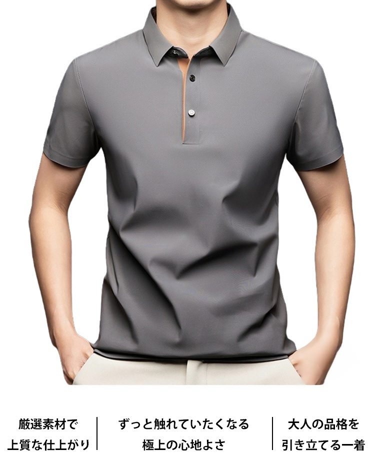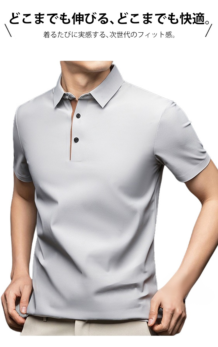 夏用メンズ半袖ポロシャツ アイスシルク涼感素材 4方向ストレッチ  薄手 シワ防止 アイロン不要 メンズ速乾襟付きTシャツ
